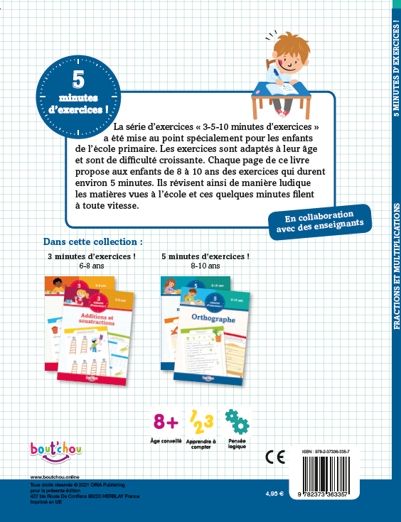 La série d’exercices « 3-5-10 minutes d’exercices » a été mise au point spécialement pour les enfants de l’école primaire. Les exercices sont adaptés à leur âge et sont de difficulté croissante. Chaque page de ce livre propose aux enfants de 8 à 10 ans des exercices qui durent environ 5 minutes. Ils révisent ainsi de manière ludique les matières vues à l’école et ces quelques minutes filent à toute vitesse.