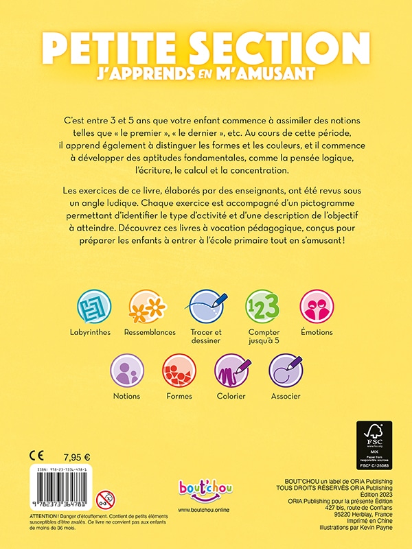 Les exercices de ce livre, élaborés par des enseignants, ont été revus sous un angle ludique. Chaque exercice est accompagné d’un pictogramme permettant d’identifier le type d’activité et d’une description de l’objectif à atteindre. Découvrez ces livres à vocation pédagogique, conçus pour préparer les enfants à entrer à l’école primaire tout en s’amusant!
